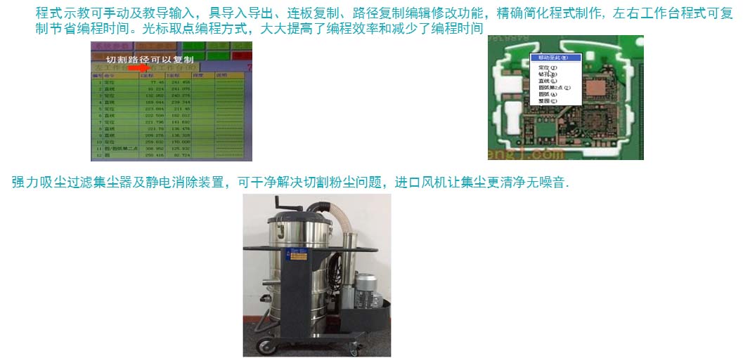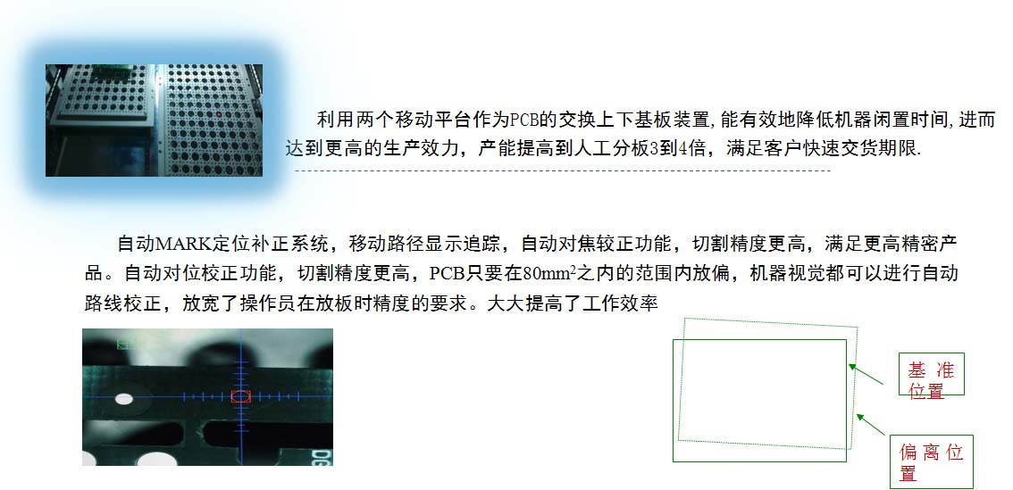 自動MARK點定位校正系統(tǒng),移動路徑有實時顯示和模擬路線跟蹤,顯示一目了然,自動對位校正功能,切割精度更高,PCB只要在3mm之內的范圍內放偏,機器視覺都可以進行自動路線校正,放寬了操作員在放板時精度的要求。大大提高了工作效率。