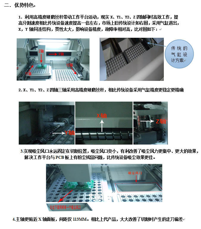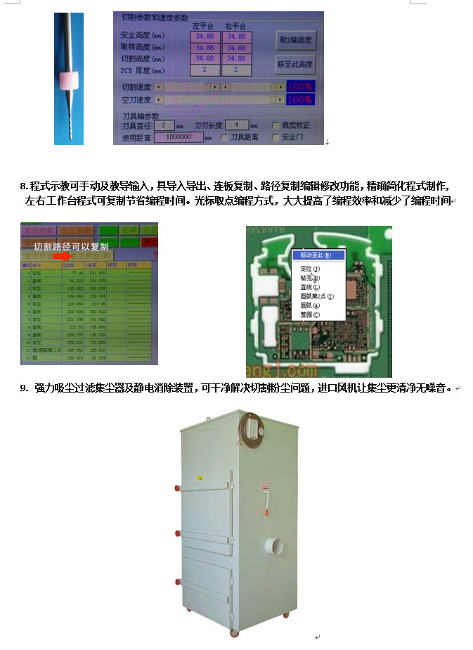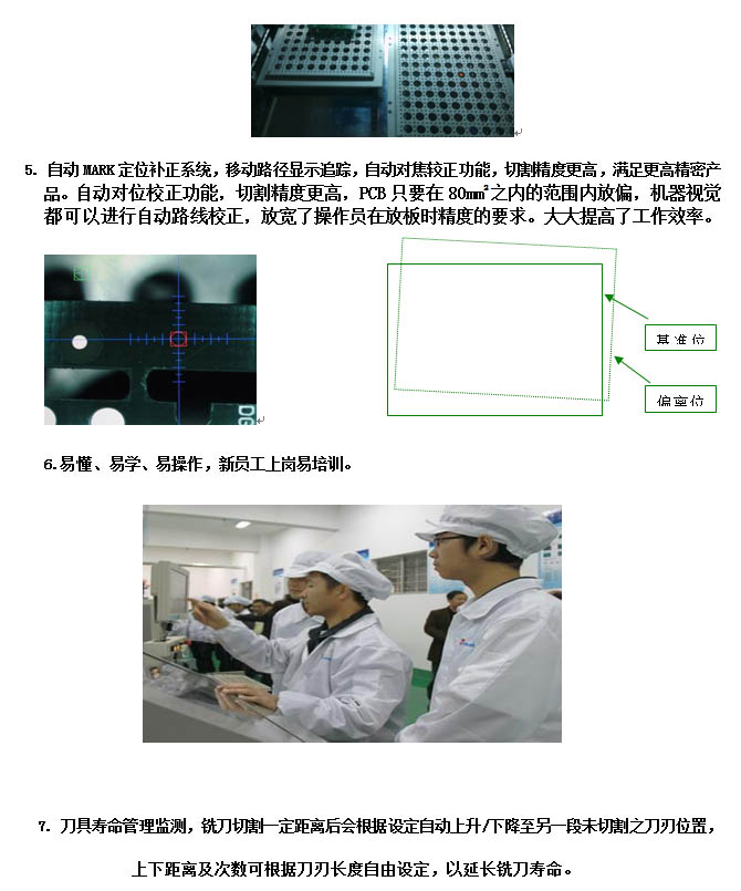 3.自動(dòng)MARK點(diǎn)定位校正系統(tǒng),移動(dòng)路徑有寶時(shí)顯示和模凝路線跟蹤,顯示一目了然,自動(dòng)對(duì)立校正功能,切割精度更高,PCB低要在3mm之內(nèi)的范圍內(nèi)放偏,機(jī)器視覺(jué)都可以進(jìn)行自動(dòng)路線校正,放寬了操作員在放板時(shí)精度的要求,大大提高了工作效率。